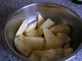 Intre timp se curata cartofii, se taie bucati mari si se pun la marinat cu ierburi, zeama de lamaie vinul si uleiul de masline.