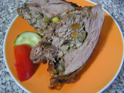 Surplusul de carne se toaca (sau se taie marunt, asa cum am facut eu), se amesteca cu zarzavaturile, tocate si ele, cu sare si piper si cu fisticul. Se da forma de sul si se aseaza intr-o margine a dreptunghiului de carne.